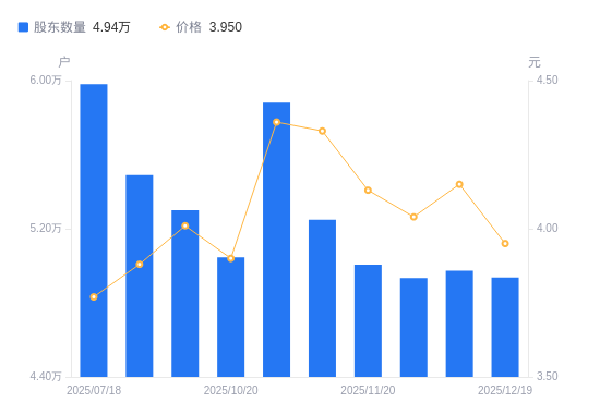 日期A股户数(户)流通A股户均持股数(股)户均持股市值(万元)2025-12-104974228377.2811.782025-11-304933928609.0711.562025-11-205006228195.8911.642025-11-105247826897.8011.652025-10-315881623999.3010.462025-10-205046127972.9410.912025-10-105299826633.8910.682025-09-305489125715.389.982025-07-185981223599.668.902025-06-306396222068.468.02